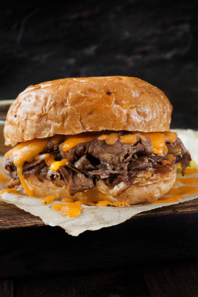 Roast Beef and Cheddar Sandwich with Au jus on a Toasted Onion Bun